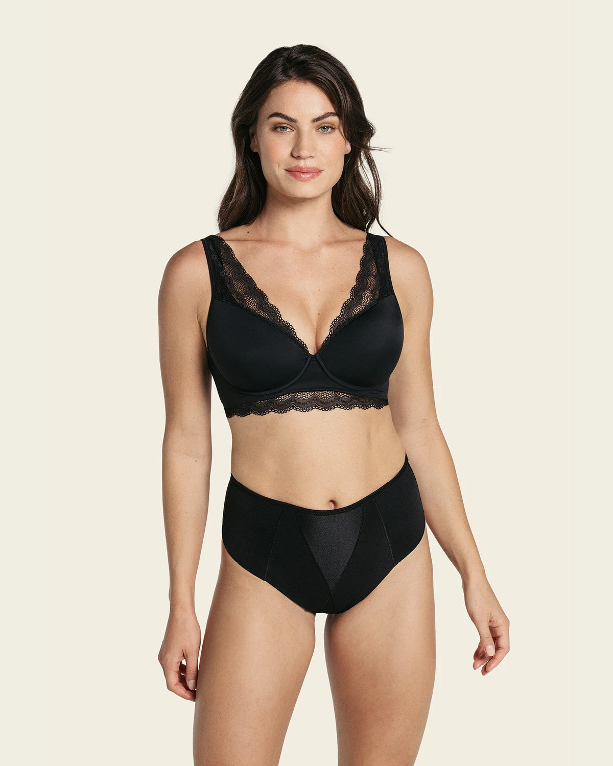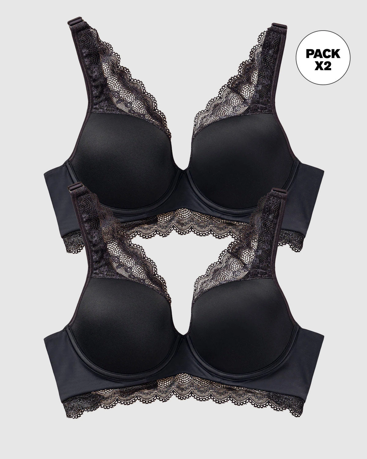 A 2-pack of beautiful bras that give you coverage and support. They feature full-coverage triangle cups with a plunge-style front, plus high coverage under the arms and along the back for a smoothing effect. Underwire adds excellent support and comfort. Lightly-lined cups are designed for a perfect fit. Wide, foam padded straps are comfy on the shoulders – you’ll forget you’re even wearing it! Our signature SmartLace lines the underbust band, cups, and straps for a luxurious look and feel. Get one for every day!