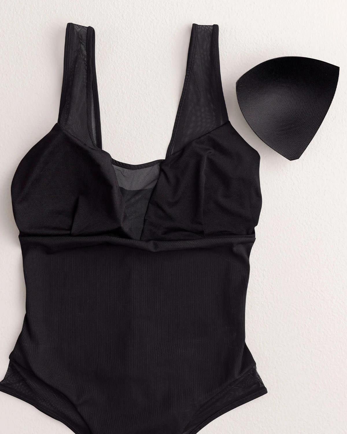 A one-piece swimsuit that has firm compression to sculpt the tummy. It has removable contour padding, which you can wear for a rounded look or remove for a completely natural silhouette. There’s also an elasticated underbust band for support. The sheer details scattered throughout give this swimsuit a sophisticated and unique look, and the fabric is a little shiny for that extra wow factor. The fixed straps are wide and supportive. This swimsuit is so cute you can wear it as a bodysuit with casual outfits!