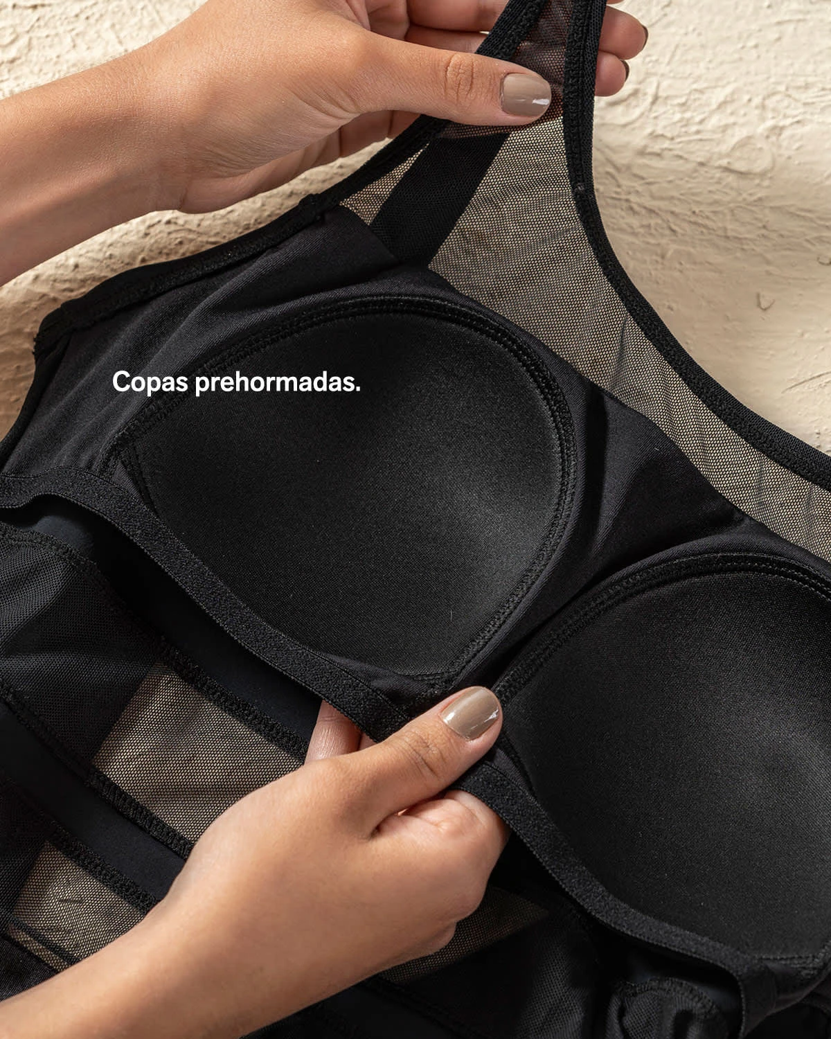 This one-piece swimsuit smooths out your curves in style. It has built-in compression to gently flatten the lower tummy. Fixed contour cups and an elasticated underbust band offer a rounding effect, while wide straps provide extra support. Mesh cutouts at the waist and chest create a unique silhouette.