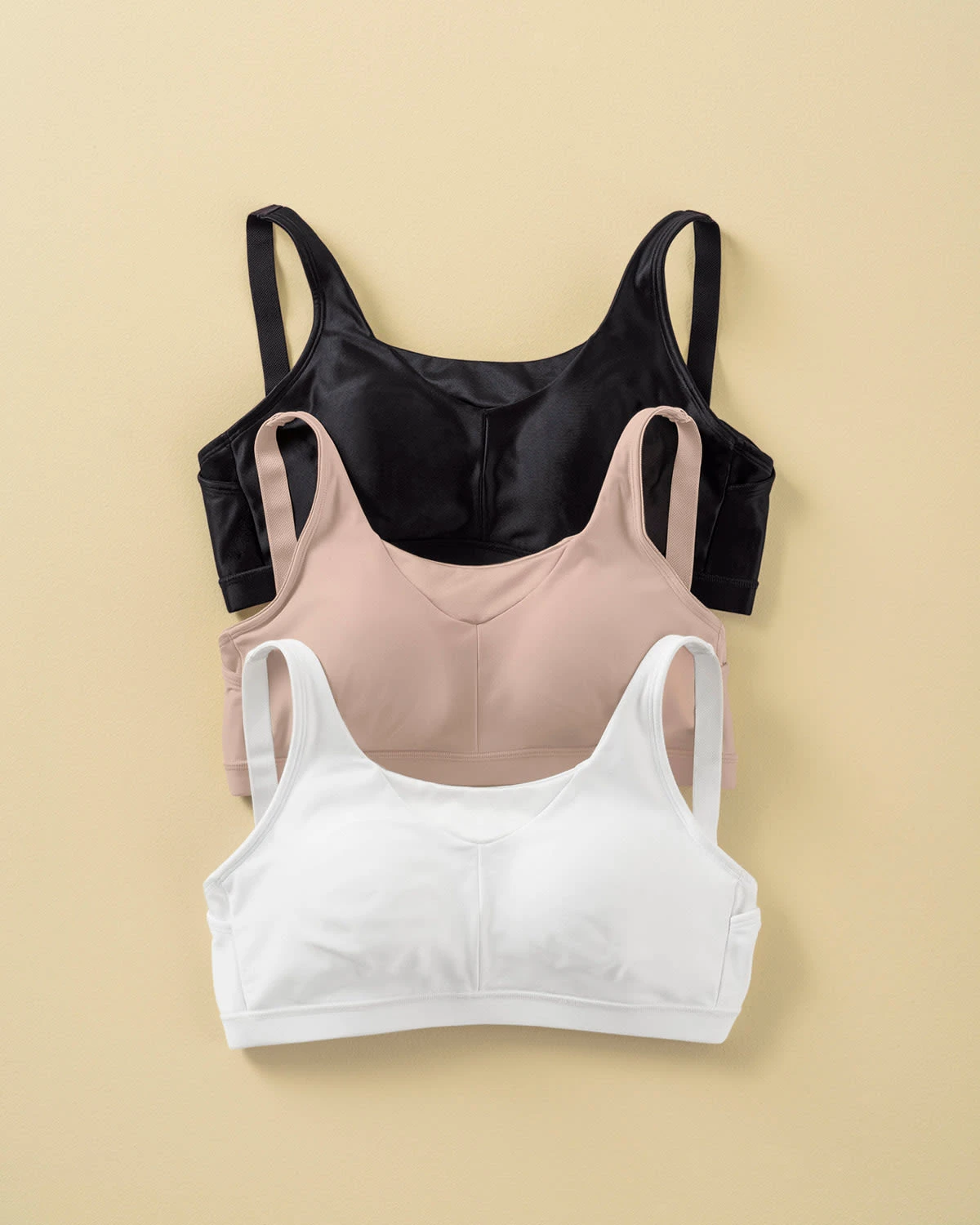- Double-layered pocketed fabric cups with removable contour padding.